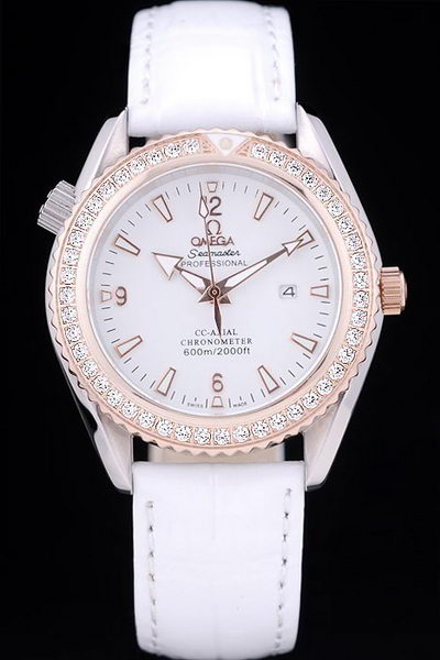 Bracelet: Omega heat embossed white patent crocodile leather strap with Omega inscribed 18k rose-gold plated hook-buckle clasp